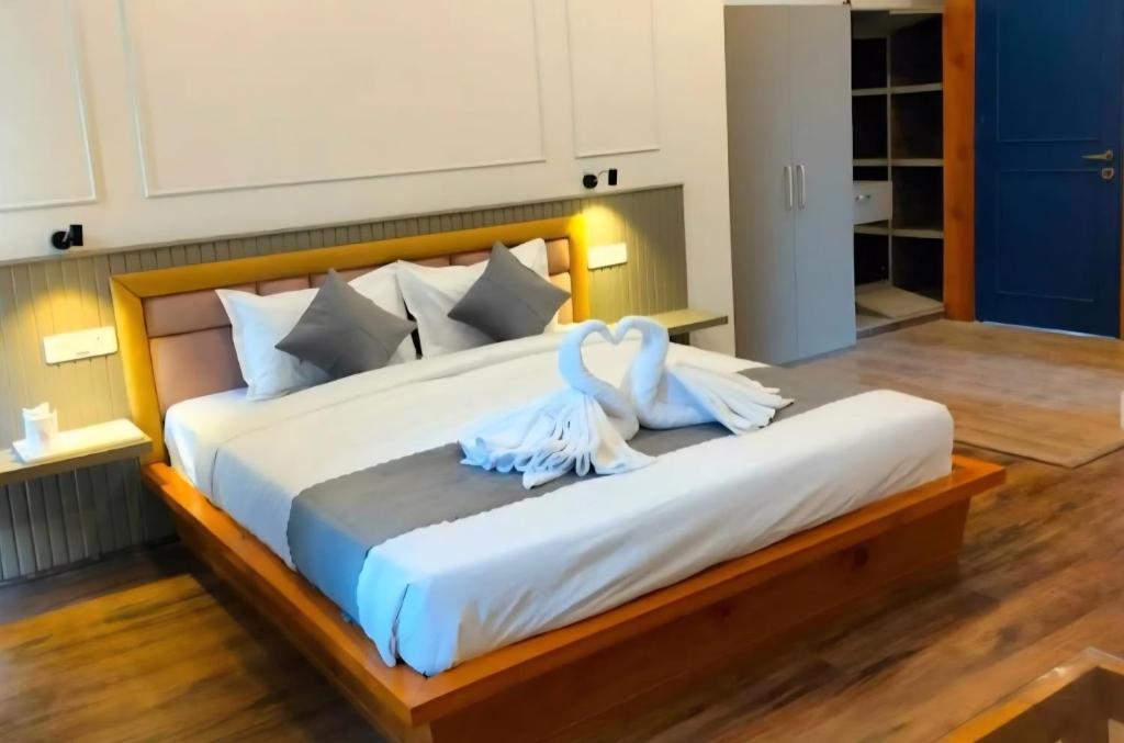 Beautifully appointed room with a king-size platform bed, towel art welcome, wardrobe space, and all modern comforts for a memorable stay.